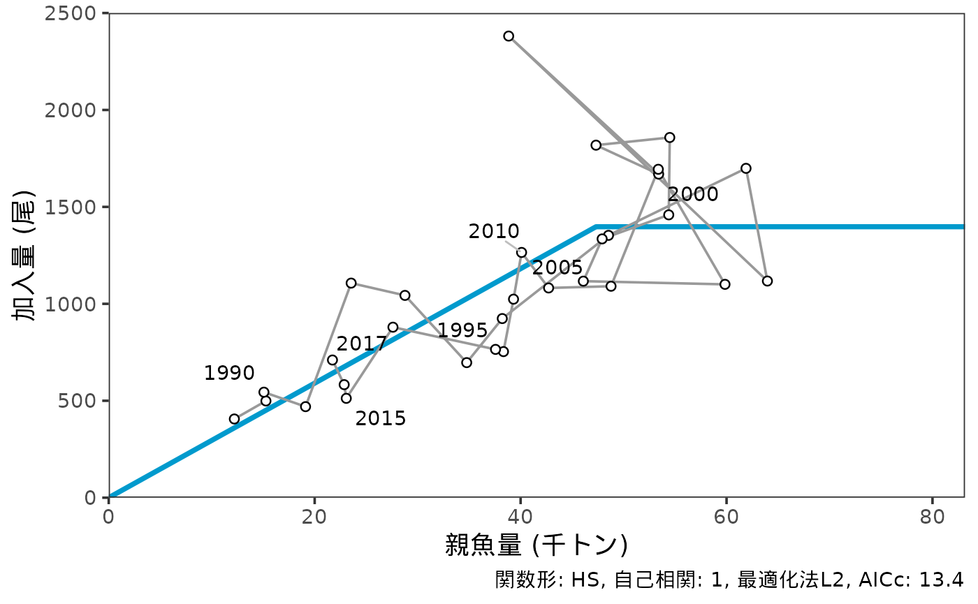 ## 再生産関係にHockey-Stick型を指定(SR="HS")します。推定方法を最小二乗法とし(method="L2")、自己相関を仮定しない(AR=0)場合。